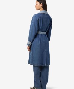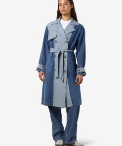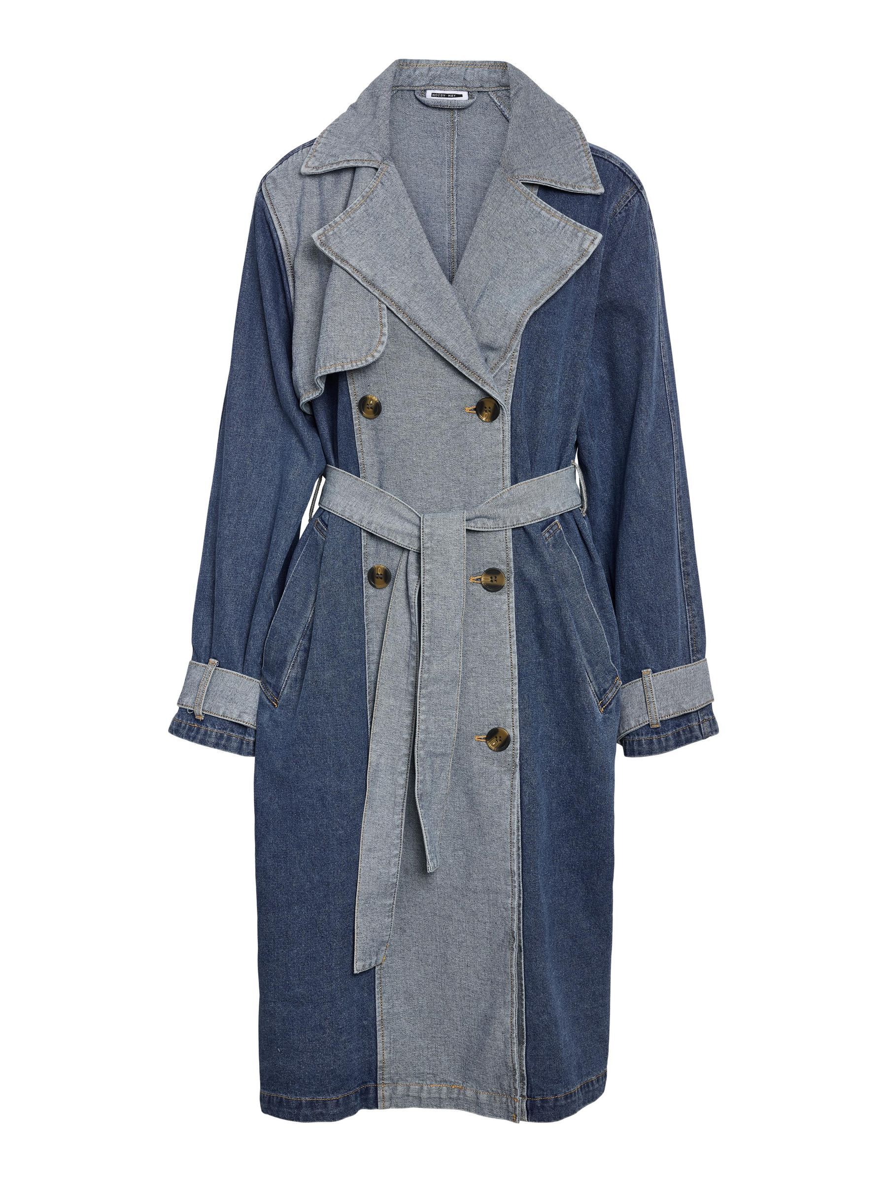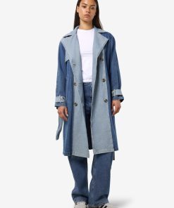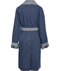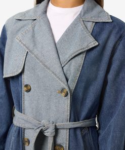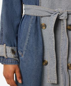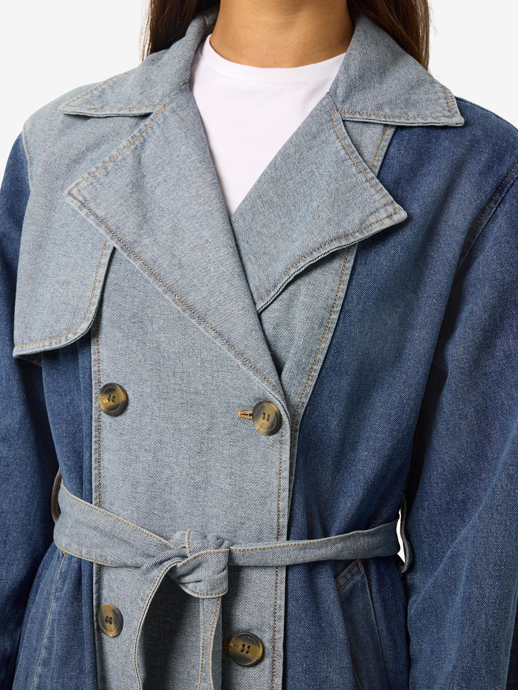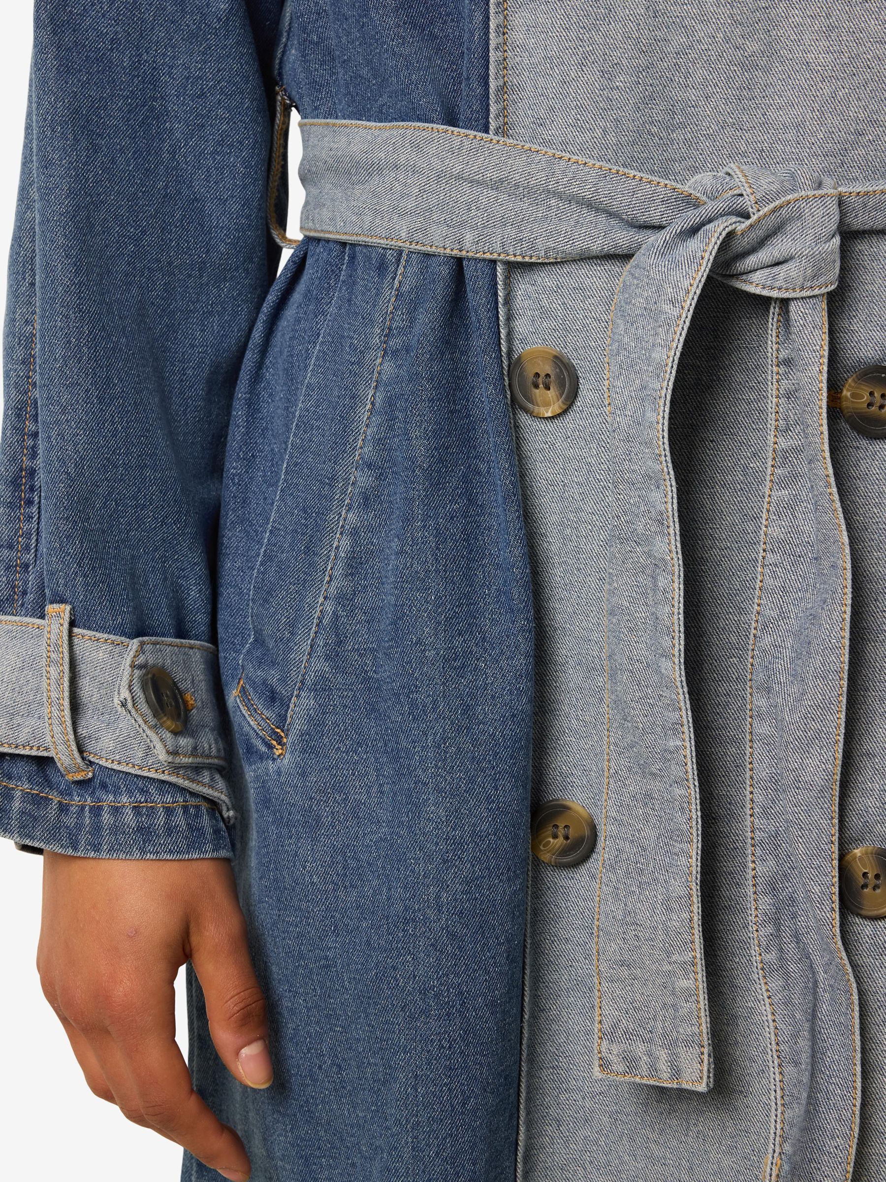 – Two-tone denim trenchcoat- Spread collar- Front storm flap- Dropped shoulders- Long sleeves- Buttoned tab cuffs- Double-breasted- Tie-belt at waist- Side pockets- Single vent at back- Relaxed fit- Model is wearing size M