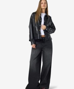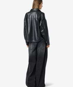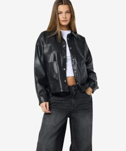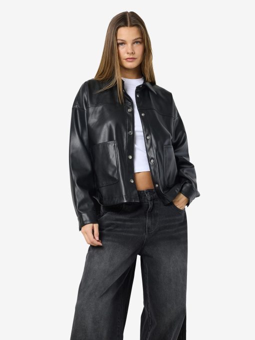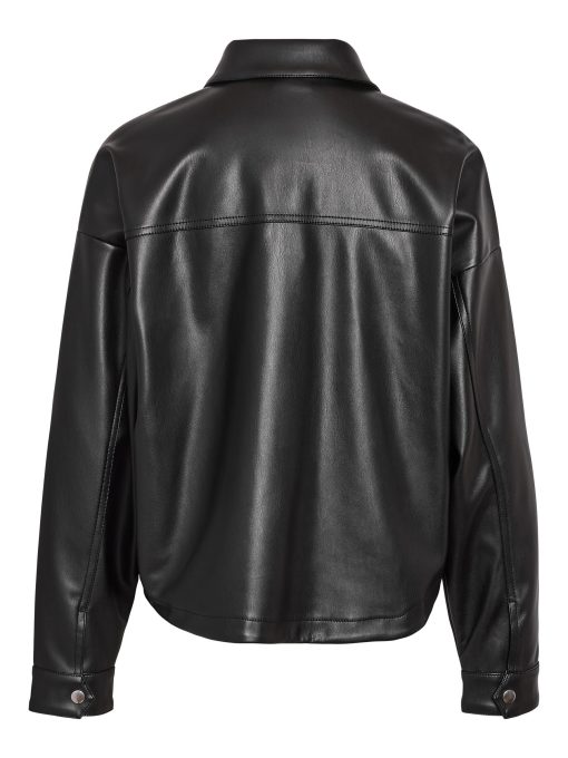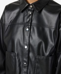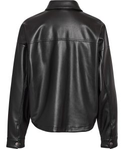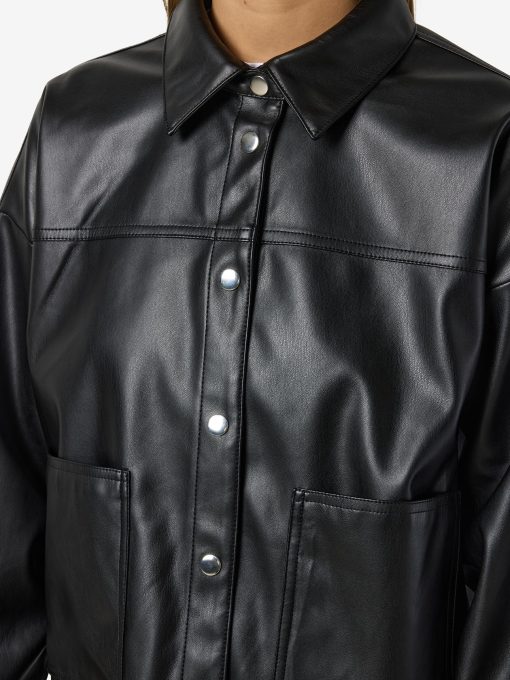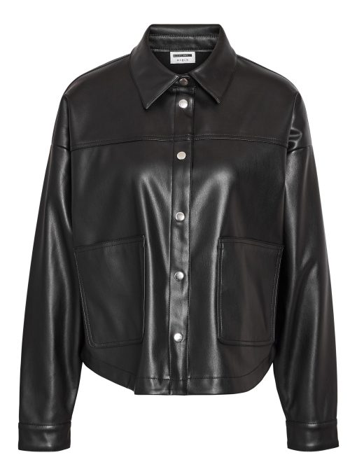 – Coated jacket for a faux leather effect- Pointed collar- Dropped shoulders- Long sleeves- Buttoned cuffs- Full press stud placket- Front patch pockets- Regular fit- Model is wearing size M