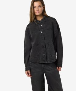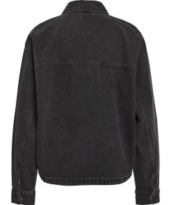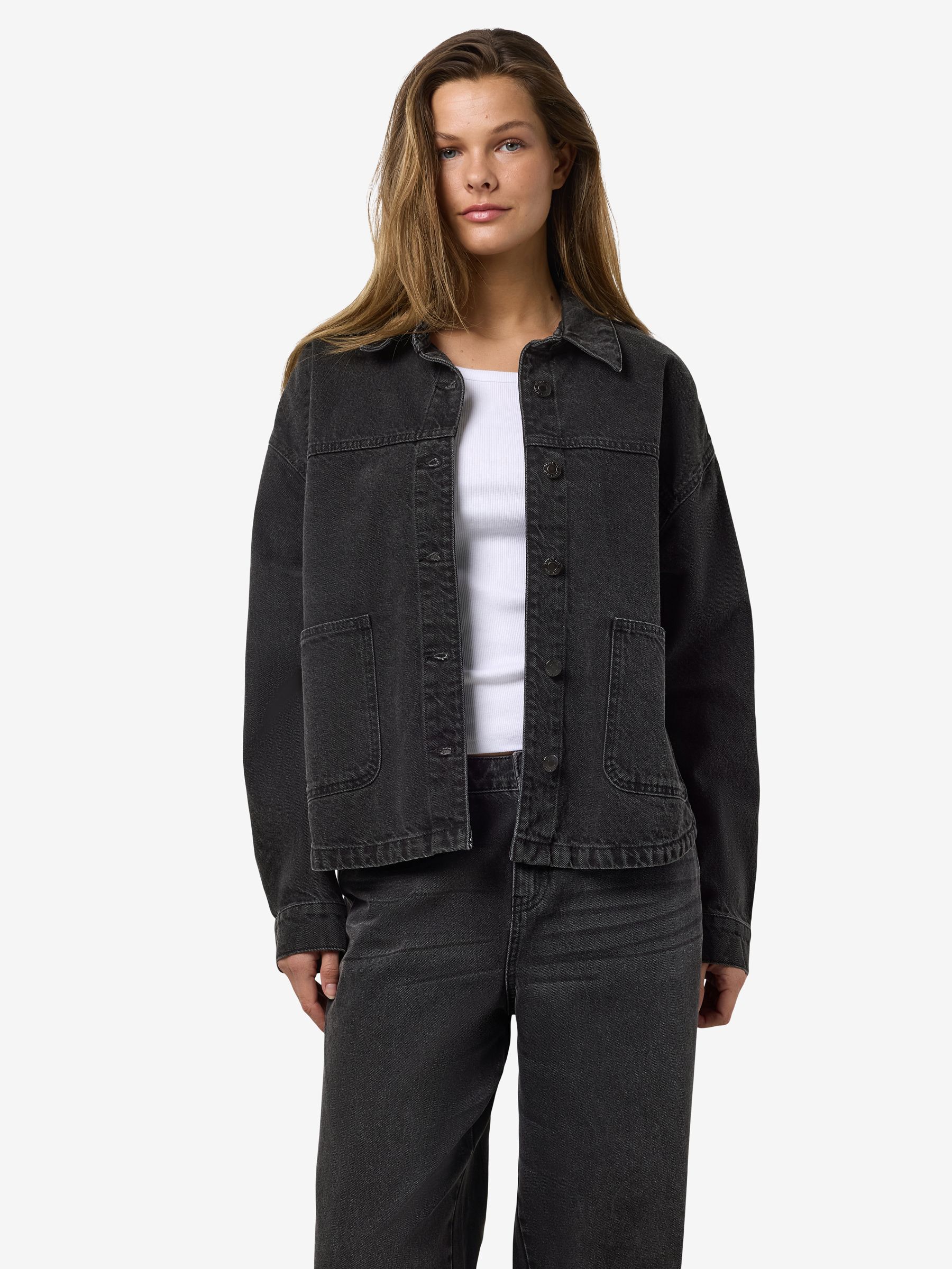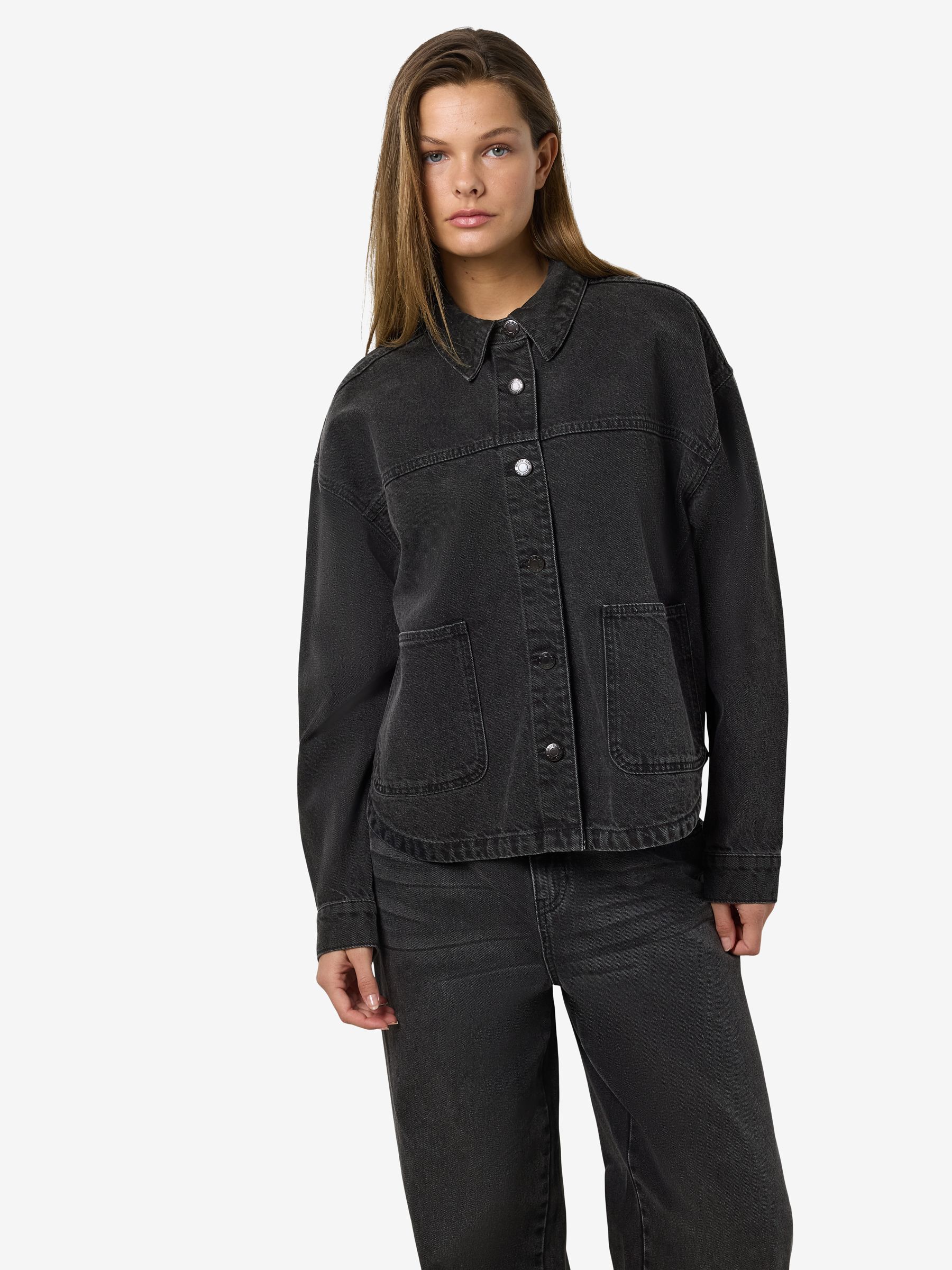 – Long sleeved denim jacket- Pointed collar- Dropped shoulders- Long sleeve with buttoned cuffs- Button-up front- Front patch pockets- Curve hem- Relaxed fit- Model is wearing size M